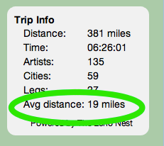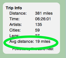 The beginning of each leg is represented by a green ball. You can click on the ball to see what artists will be played during that leg. The app plays music via Rdio using their nifty Web Player API. If you are an Rdio subscriber you can listen to full streams, and if not you get to hear 30 second samples. One bit of interesting info that I show for a route is the ‘Avg distance’. This shows the average distance to each artist on the roadtrip. If this number is low, you are traveling through a musically dense part of the world, and if it is high, you are traveling in a sparse musical region. For instance, for a roadtrip from Boston to New York the average artist distance is 3 miles (about as low as it goes). However, if you are traveling from Omaha to Denver, the average artist distance is 81 miles.
