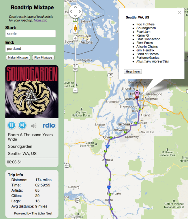 For this app, I collected the locations for the top 100,000 or so most popular artists in the Rdio catalog. These artists were from about 15,000 different cities. I used geopy along with the Yahoo Placefinder geocoder to find the latitude and longitude for each of these cities. For the mapping and route finding, I used version 3.9 of the Google maps API. For music playback I used the Rdio Web Playback API. With the tight integration between the Echo Nest and Rdio ID spaces it was easy to go from a geolocated Echo Nest artist to a list of Rdio track IDs for songs by that artist.