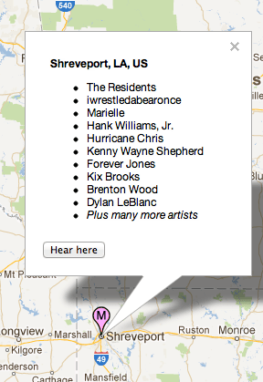 You can also click anywhere on the map to see and listen to nearby artists. For example, if you click on Shreveport you’ll see something like this: