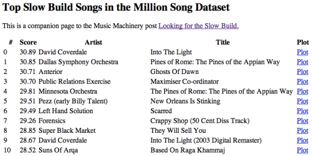 This code takes less than a half hour to run on 50 small EC2 instances and finds a bucketload of Slow Build songs. I’ve created a page of plots of the top 500 or so Slow Build songs found by this job. There are all sorts of hidden gems in there. Go check it out: