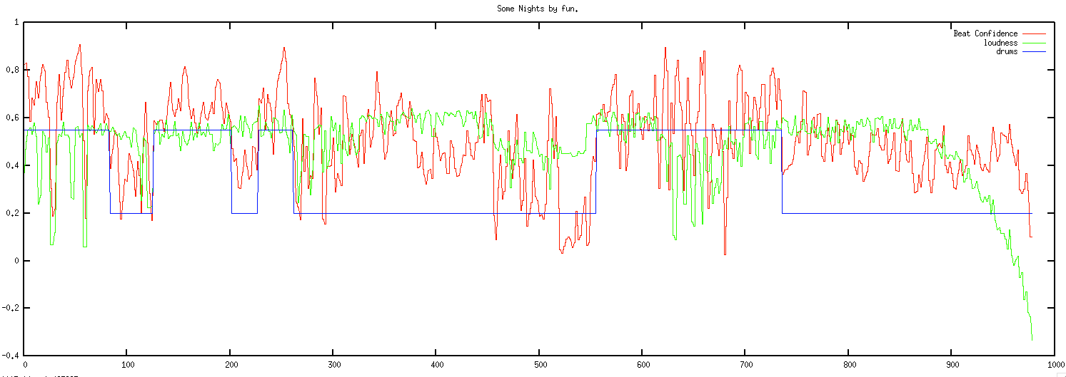 For example, here’s a plot that shows the beat confidence level for the first few hundred beats of Some Nights.