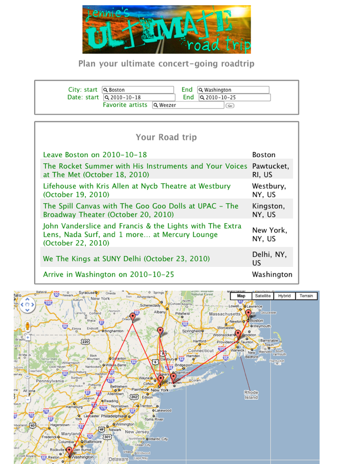 Last weekend at Music Hack Day Boston, I teamed up with Jennie, my 15-year-old daughter, to build her idea for a music hack which we’ve called Jennie’s Ultimate Road Trip. The hack helps you plan a road trip so that you’ll maximize the number of great concerts you can attend along the way. You give the app your starting and ending city, your starting and ending dates, and the names of some of your favorite artists and Jennie’s Ultimate Road Trip will search through the many events to find the ones that fit your route schedule that you’d like to see and gives you an itinerary and map.