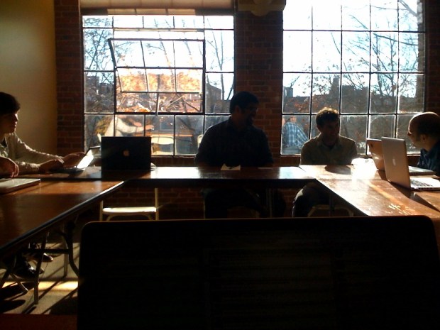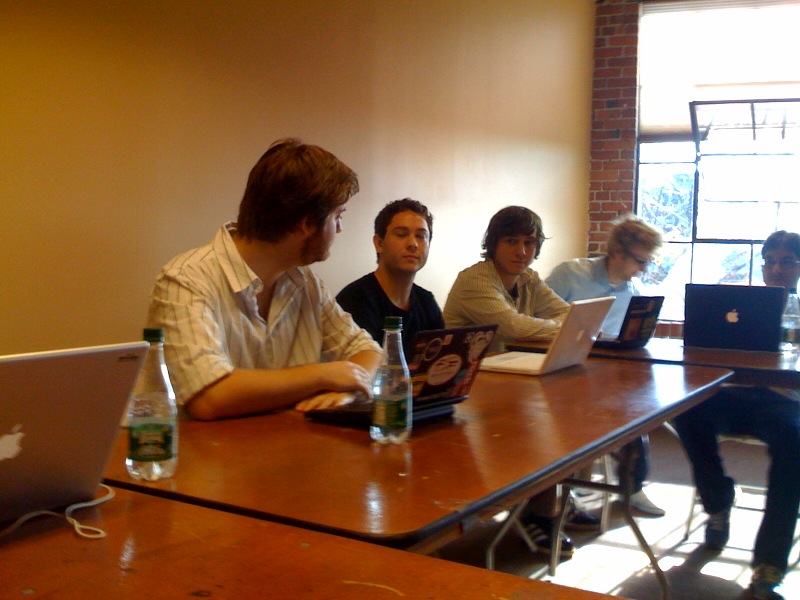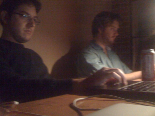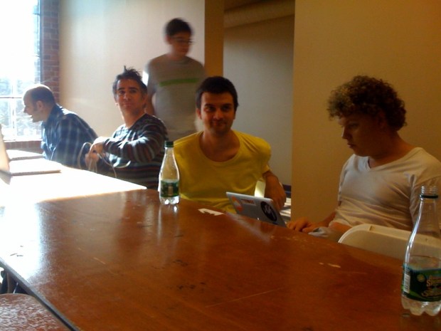 Music Hack Day hacking continues at the Hack Nest. Here’s my view in the Playdar room: Tobyp, RJ, jwheare and the fingers of jherskowitz