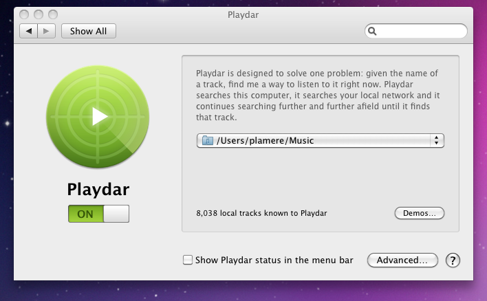 Playdar got a couple of steps closer to being ready for the general public this week. First of all , there are now installers for Windows and Mac that make it dead simple to install Playdar. I tried the Mac OS X version (by Max Howell). It could not have been easier to install. I downloaded a file opened it, clicked on the pane and Playdar was added to my Prefs panel. It scanned my music and I was ready to go. Quite the contrast to a couple weeks ago when I hurt myself when trying to compile Erlang from source.