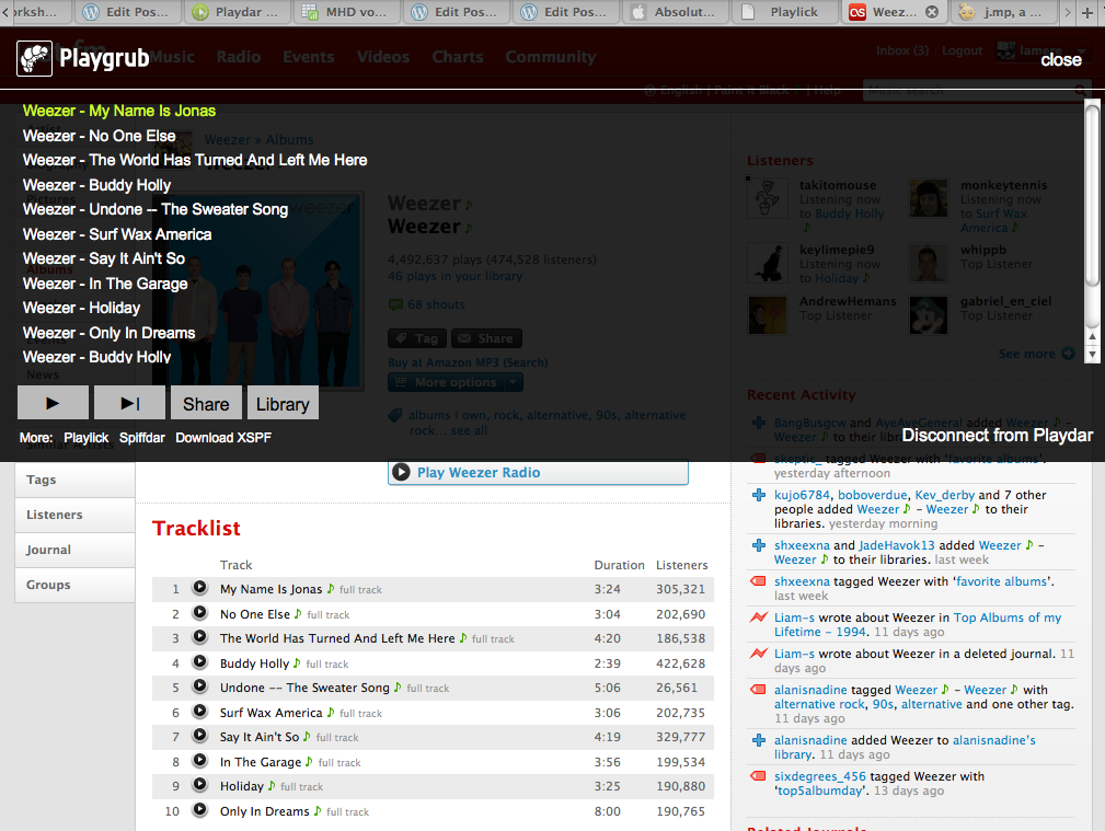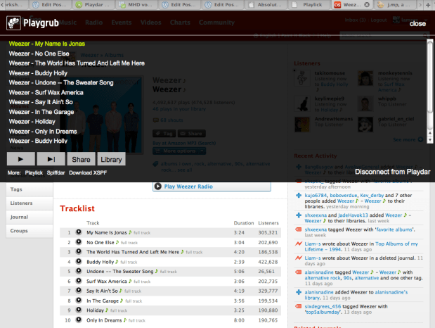 Now that Playdar is easy to install, we need some apps. Luckily Toby has been working hard on Playgrub. Playgrub is a an app that you install in your browser tool bar. When you visit a web page that mentions music, click on the ‘grub’ link and Playgrub will scour the page for all the artists and tracks, resolve them using Playdar and give you a playlist for the page. Here’s Playgrub in action. I visited the Last.fm page for the Weezer Blue album. I clicked on Playgrub and in a few seconds, Playgrub showed me this: