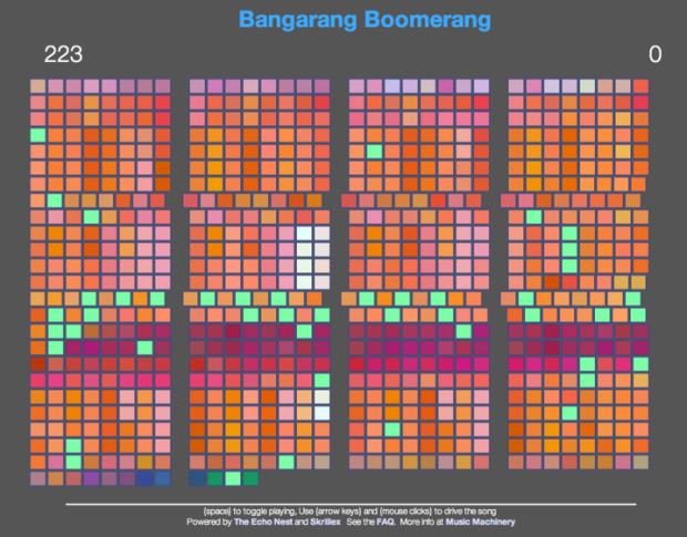 My latest music hack is Bangarang Boomerang. It is a web app (runs in Chrome or the latest Safari), that lets you ‘drive’ the Skrillex song. You can freeze-frame the song on a beat, you can make the song go backwards beat by beat, you can advance through the song at double time, or triple time, and set bookmarks to let you easily jump to different sections of the song. It is a rather fun app that lets you feel like a musician, even if you have very little musical talent.