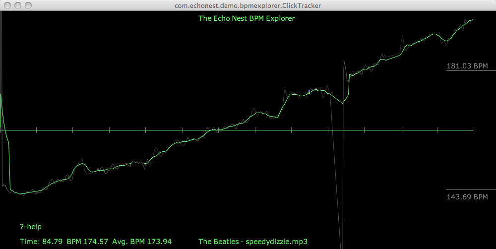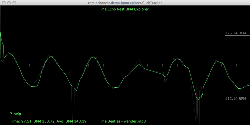 Look for the release that supports time and pitch stretching in remix this week. I’ll be sure to post here when it is released. To use the remix API you’ll need an Echo Nest API key, which you can get for free from developer.echonest.com.The click plots were created with the Echo Nest BPM explorer – which is a Java webstart app that you can launch from your browser at The Echo Nest BPM Explorer site.