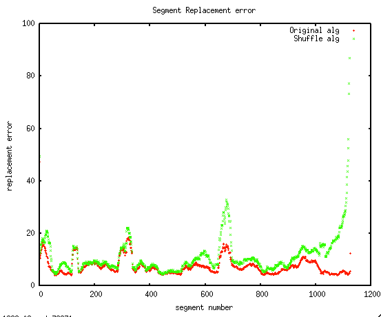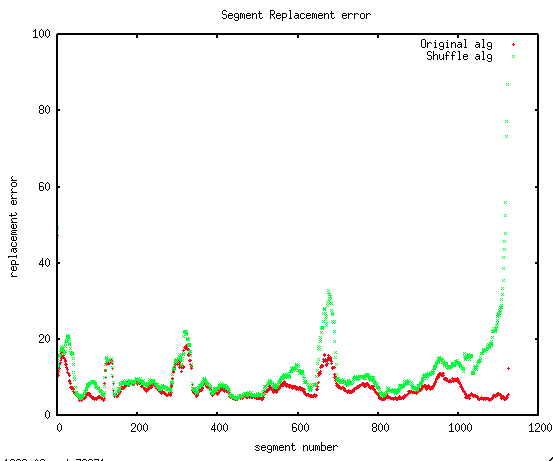 I was curious to see how much extra error there was in the later segments, so I plotted the segment fitting error. In this plot, the red line is the fitting error for the original algorithm and the green line is the fitting error for shuffling algorithm. I was happy to see that for most of the song, there is very little extra error in the shuffling algorithm, things only get bad in the last 10% of the song.