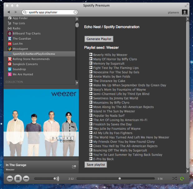This morning I created a Spotify App that demonstrates how to use the Spotify and Echo Nest APIs together. The app is a simple playlister with the following functions: