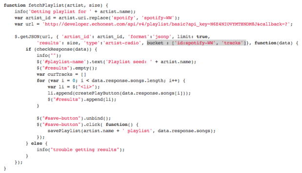 fetchPlayst() – The bulk of the work is done in the fetchPlaylist method. This method makes a jsonp call to the Echo Nest API to generate a playlist seeded with the Spotify artist. The Spotify Artist ID needs to be massaged slightly. In the Echo Nest world Spotify artist IDs look like ‘spotify-WW:artist:12341234’ so we convert from the Spotify form to the Echo Nest form with the one liner: