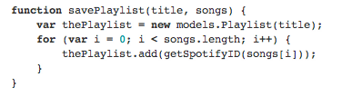 The entire app, including all of the HTML, CSS and JavaScript, is 150 lines long.I’ve made all the code available in the github repository SpotifyEchoNestPlaylistDemo. Here are some of the salient bits. (apologies for the screenshots of code. WordPress.com has poor support for embedding sourcecode. I’ve been waiting for gist embeds for a year)