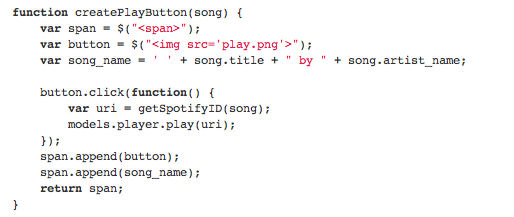 The function createPlayButton creates a doc element with a clickable play image, that when clicked, calls the playSong method, which grabs the Spotify Track ID from the song and tells Spotify to play it: