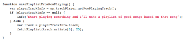 makePlaylistFromNowPlaying() – grabs the current track from spotify and fetches and displays the playlist from The Echo Nest.