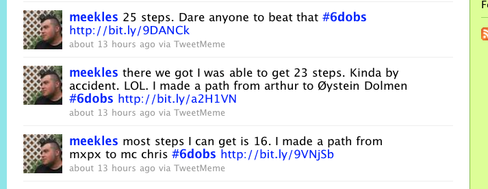 - When you find a path that you think is longer than any found so far, tweet the path with its length and the hashtags #6dobs and #longest. For example: I made a 25 step path from arthur to Eivind Fjoseide #6dobs #longest http://bit.ly/9DANCk