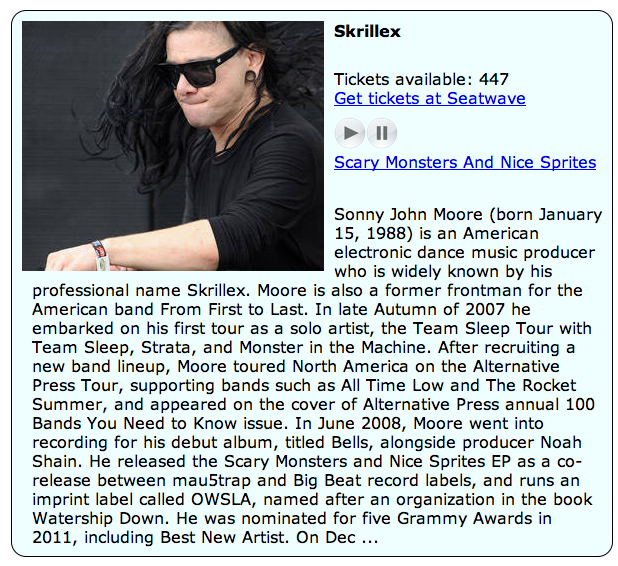 To show off the integration of Seatwave and Echo Nest, I’ve built a little web app that shows a list of top Seatwave concerts (generated via the Seatwave API). For each artist, the app shows the number of tickets available, the artist’s biography, along with a play button that will let you listen to a sample of the artist (via 7Digital).