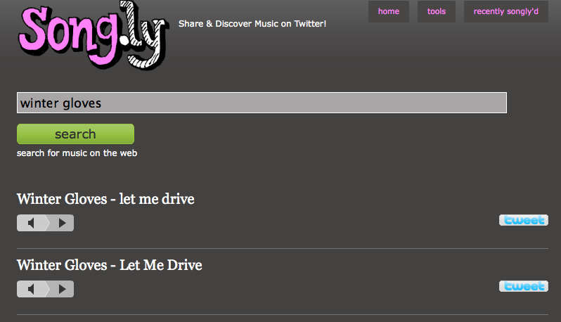 - Search for a song that you want to tweet. The catalog seems pretty big, so you’ll find most popular songs, and many unpopular ones – for instance, I had no problems finding a track by Winter Gloves, an Indie band from Montreal.