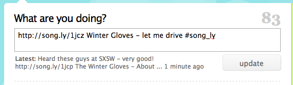 I like the low impact model of Song.ly – I don’t have to register or login. If I want to tweet a song I just right click and go. Nice and easy.